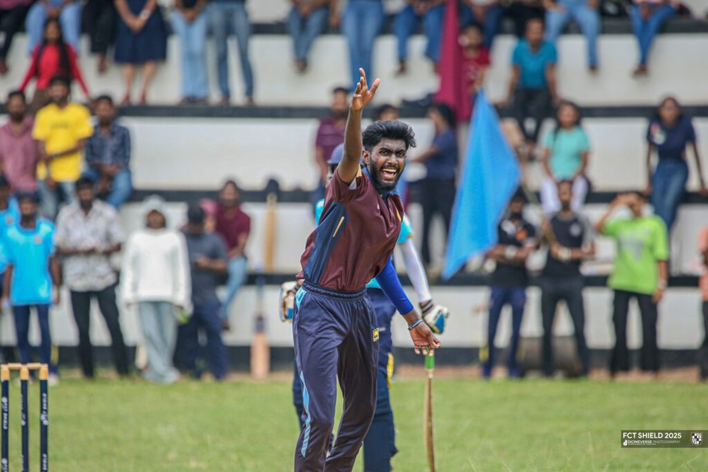 The match began with immediate drama. Just like in the opening game, Damindu Prasadith made an early impact, striking in the very first over to dismiss Hiran Ruchiranga. He returned in the third over to remove Udeesha Raveeshan, leaving ET reeling at 17 for 2. Captain Sahan Sudeesha and Hasitha Gunathilaka tried to steady the innings with a cautious approach, but the momentum shifted again in the sixth over. Sahan fell, followed quickly by Chathuruwan Nadeeshana, reducing ET to 35 for 4 in just 5.3 overs.